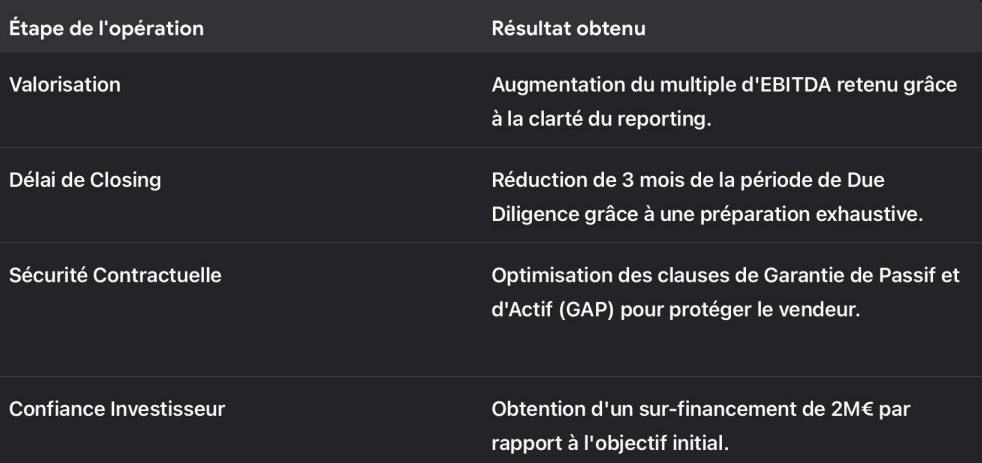 Notre cabinet est intervenu en amont de l’opération pour assainir la structure financière et transformer les données comptables en indicateurs de performance (KPIs) stratégiques.